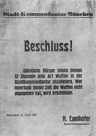 ![]() Public order on the issue of arms on 14 April 1919, signed by Munich city commandant Rudolf Egelhofer. It was one of the first measures of the new communist leadership of the Bavarian Soviet Republic after the failed Palm Sunday Putsch.[a] | |||||||