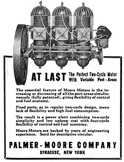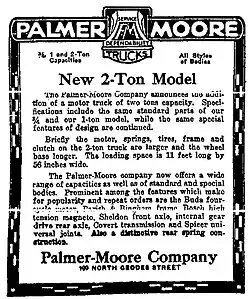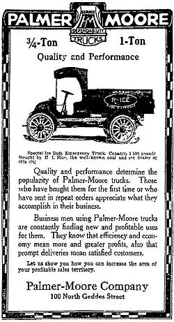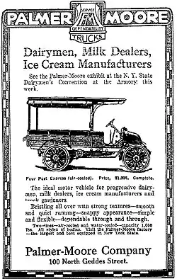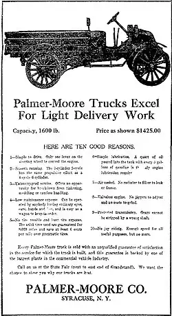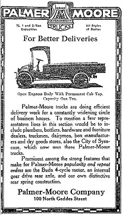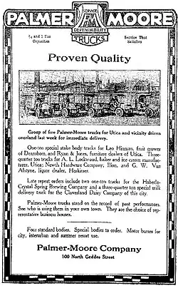 The Palmer-Moore Company (1906–1918) was a manufacturer of gasoline and air-cooled motor engines and marine engines in Syracuse, New York. The company began production of commercial trucks beginning in 1912. They were the third manufacturer in the city in the business and specialized in the manufacture of custom designs for local industries.