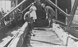The Palmer River Gold Company N.L., a Cairns company, took up ground along the Palmer River between Frome and Strathleven and carried out dredging operations between 1926 and 1935. The company originally estimated that 2.6 million cubic metres of auriferous material (rocks bearing gold) was available but after four years work it was found that the yields were less than 25% of the anticipated values. A total of 3,584 ounces (101,600 g) of gold was won during this period. The all-steel bucket dredge and pontoon was built by Messrs Chas. Ruwolt Pty Ltd of Richmond, Victoria and shipped to Cooktown then railed to Laura in mid 1930. From there, the dredging plant weighing in total 350 long tons (360 t) was carted by six-wheeled trucks (Morris and Thornycroft) over the Great Dividing Range to Strathleven, a distance of 133 kilometres (83 mi). The largest portion of the road was made by the company.[1]