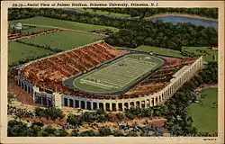 Palmer Stadium was a stadium in Princeton, New Jersey, United States. It hosted the Princeton University Tigers football team, as well as the track and field team.[1] The stadium held 45,750 people at its peak and was opened in 1914 with a game against Dartmouth. It closed in 1996 with a game against Dartmouth. Princeton Stadium was built on the site (albeit pushed slightly further north) in 1997. The building was named for Stephen S. Palmer, a trustee of the university, by his son, Edgar Palmer III. Like Harvard Stadium, it was horseshoe-shaped (which was modeled after the Greek Olympic Stadium), but was wider, including a full-sized track (around the football field) . It opened to the south (facing Lake Carnegie) and the grand main entrance was at the north.