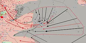 The first day of fighting left 70 Syrian Army and 40 ISIL fighters dead, including the offensive's top ISIL commander.[11] On 14 May, the Syrian Army shelled Burj al-Ishara,[27] while ISIL made an attempt to break into the city of Palmyra.[28] The jihadists managed to enter the neighbourhoods in the eastern outskirts of the city, but were expelled by government troops.[17][29][30] After re-securing once again the Muktab Al-Dour checkpoint, government forces reportedly advanced to the village of Al-Basateen, where the eastern frontline remained that night.[17] ISIL also targeted during the day the Tadmor Prison and the airport in an attempt to seize the airbase's major weapons depot.[31] Elsewhere, government troops took full control of the Al-Hayl Gas Field, killing 32 militants, after which they proceeded to take Al-Thathah, Al-Fawl, Al-Mujawar, Al-Hawa, and Al-Sina'a. According to a military source, ISIL was still positioned one kilometer from Amiriya, and was in control of al-Sukhnah, but the Syrian Army remained at the outskirts of the village.[17]
