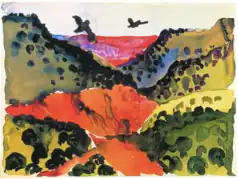 Inspired by the principles of Arthur Wesley Dow and the Texas landscape, O'Keeffe made paintings using vibrant red, blue and yellow colors.[5] About 1916, she used brilliant red and yellow colors in Special #21: Palo Duro Canyon, which belongs to the New Mexico Museum of Art. It was stolen in December 2003 and has not been recovered.[5] Red Landscape is an abstract expressionist oil painting made in 1916–1917 of the bright red canyon walls,[1] which are the Permian Red Beds from the Jurassic era. A yellow sun shines below a dark sky.[6] Canyon with Crows, a watercolor made in 1917, "depicts a deep purple arroyo that lightens higher to yellows and orange while impressionistic black crows hover in a pale blue sky."[6]