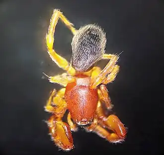 Palpimanidae, also known as palp-footed spiders, is a family of araneomorph spiders first described by Tamerlan Thorell in 1890.[1] They are widely distributed throughout the tropical and subtropical regions of the world, the Mediterranean and one in Uzbekistan, but not Australia. They are not common and there is a high degree of endemism.[2]