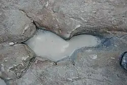 Peculiar indistinct and elongate tracks had long been known to the locals as "man tracks" or "moccasin tracks". Since 1939, young-Earth creationists began to popularise the tracks, claiming that some tracks were made by mythological giant humans who lived at the same time as the dinosaurs who created the other tracks on the same surfaces.[7] This idea became widely known especially due to the 1970 film "Footprints in Stone" by Stanley Taylor; one of the most human-like trackways has been dubbed the "Taylor trail".[2][6] John Whitcomb, Henry Morris, John Morris, and Carl Baugh all are current or former proponents of the human footprint hypothesis. Though there are some that still cite the trackways as evidence against the geological time scale, the general consensus is that all of the human tracks were either fake or interpreted incorrectly.[8][9][10]