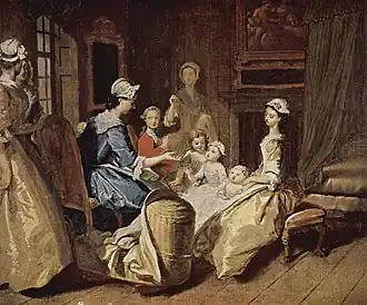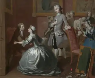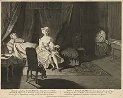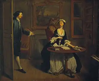 The book was already a popular one for painters - the younger artist Francis Hayman had produced designs for Gravelot's engravings for the 1742 edition[1] as well as a pair of scenes from the novel for Vauxhall Gardens, also around 1742[2] (one is lost and the other is now in the National Trust's collections at Sizergh Castle[3]). Highmore painted his series of twelve works between 1741 and 1743 and on 16 February 1744 advertised that ten of them were ready to be viewed at his studio, with another advertisement on 10 May announcing that all twelve paintings in the set were complete. The first advertisement also stated he was taking subscriptions for a set of twelve engravings after the novel[4] — Highmore had Louis Truchy and Antoine Benoist produce them.[5][6]