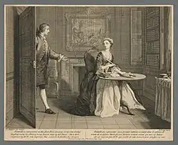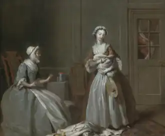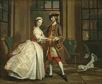 The series bears comparison with William Hogarth's contemporary series such as Marriage A-la-Mode, A Rake's Progress and A Harlot's Progress, also painted for the print market, but it differs from them in that they derive from a concrete literary source rather than the artist's plot-lines. Art historians see the Pamela series as placing Highmore alongside Hogarth and Hayman as "one of the initiators of a British school of narrative painting".[7] Though Highmore's paintings were intended as treatments of scenes from the novel rather than strictly as illustrations, Highmore and Richardson became close friends, with the former painting the latter's portrait as well as a scene from his later novel Clarissa.