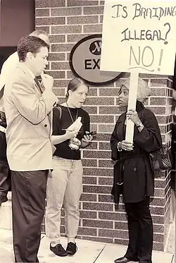 The first person to respond to this poster was a woman by the name of Cheryl Tatum. Tatum worked for the Crystal City Hyatt Hotel located in Crystal City, Virginia. On her second confrontation with the hotel, Tatum refused to take out her braids and Cornrows & Co. paid the attorney fees to file for a discrimination lawsuit. As the issues surrounding this event grew, it caught the attention of Reverend Jesse Jackson during his run for the President of the United States in 1984. Jackson stated that he would pull out from using the Hyatt if the issue was not resolved. Sydney Boone, another woman suing the Hyatt Hotel (Washington, DC), met with a coalition of blacks to boycott the Hyatt the morning Jesse Jackson, his lawyers and Hyatt Hotel officials completed their meeting. As Jesse Jackson was walking outside of the hotel, Boone and the coalition started protesting. Other companies that did not allow braids during this time, such as American Airlines and the Marriot Hotel were also met with protests and lawsuits. Uqdah, the co-owner of Cornrows and Company stated that braids and different braid styles are engraved in the history and heritage of African-American culture. Ferrell's company supported customers by paying for attorney fees and organizing the protests that took place.[4]