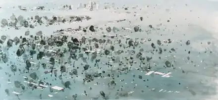 These works took as much interest in pattern and structure as in the actual events, rendering them in a generalized way; for example, the collapsed high-rise lattice of the watercolor, Building (2004), evoked any number of war or terrorism disasters, while the aerial view in the oil painting Vox Populi (2004) rendered the throng attending George W. Bush's 2000 inauguration ceremony as an undifferentiated mass.[2]