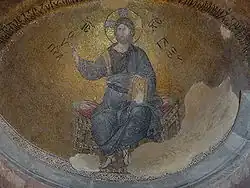 The parekklesion (side chapel) was added to the south side of the church in the early Palaiologan period, and dedicated to Christos ho Logos (Greek: Christ the Word).[3] Shortly after 1310, Martha Glabas erected a small shrine in memory of her late husband, the protostrator Michael Doukas Glabas Tarchaneiote, a general of Andronikos II Palaiologos.[4] An elegant dedicatory inscription to Christ, written by the poet Manuel Philes, runs along the inside and outside of the parekklesion.