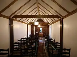 The belief that Bedford was the site of the Garden of Eden appears to have evolved from events around the expulsion of Edgar Peissart from the group in early 1923.[4][20] The expulsion involved an exorcism in the building then known as the garden room which would later become the chapel.[21][4] This in turn lead to the development of a ritual known as Casting of Controls where members of the society, sometimes present sometimes not, would be exorcised with the intent of removing the controls of Satan over them.[4] From this came the idea that the location of the chapel was a place that had always been somewhere Satan could not influence and hence the Garden of Eden.[4]