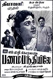 Panam Panthiyile (transl. Money is the vanguard) is a 1961 Indian Tamil-language film produced by MAV Pictures. The film was directed by Krishna Rao[1] and stars S. S. Rajendran, M. R. Radha, C. R. Vijayakumari and Rajasree.[2] It was released on 7 November 1961.[3] The film was remade in Malayalam as Ozhukkinethire.[4]