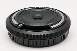 Examples of body-cap lenses include the Olympus 9mm F8 Fisheye and Olympus 15mm F8 for Micro Four Thirds and the Fujifilm XM-FL 24mm F8 for Fujifilm X-mount.[2][3]