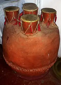 The Panchamukha Vadyam ((Malayalam: പഞ്ചമുഖ വാദ്യം, Telugu: పంచముఖ వాద్యం), Tamil: பஞ்சமுக வாத்தியம்) is a drum from India. It is a metal drum with five faces (mukha), named after the faces of Siva: Sadyojatam, Isanam, Tatpurusham, Aghoram and Vamadevam. The diameter of the central face is at a slightly larger than those of the peripheral faces. The instrument is played with both hands.[1] The pitch of the faces is adjusted by tightening or loosening the squeeze of the skin at the region of the neck and below the rim. It is used in temple music.