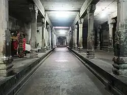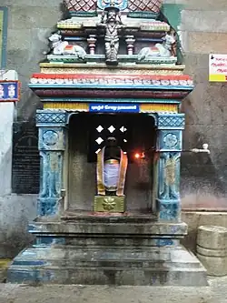 Panchavarnaswamy temple complex has three prakarams (outer courtyard) and a five-tiered rajagopuram (gateway tower). The central shrine faces east and holds the image of Panchavarnaswamy (Shiva) in the form of lingam made of granite. The granite images of the deities Ganesha (son of Shiva and god of wisdom), Murugan (son of Shiva and god of war), Nandi (the bull and transport of Shiva) and Navagraha (nine planetary deities) are located in the hall leading to the sanctum. As in other Shiva temples of Tamil Nadu, the first precinct or the walls around the sanctum of Panchavarnaswamy has images of Dakshinamurthy (Shiva as the Teacher), Durga (warrior-goddess) and Chandikeswarar (a saint and devotee of Shiva). The second precinct is surrounded by granite walls.[3]