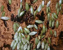 The ootheca (egg case) is 3–4 mm (0.12–0.16 in) long, is curved, and has indentations that show where the eggs are located.[4] A study found that they contained 28 to 60 eggs (average 46).[5] The ootheca is carried internally by the female until the eggs hatch.[4] At 24 °C (75 °F) the eggs hatch in about 48 days, after which male nymphs mature in about 144 days, and female nymphs mature in about 181 days.[4]