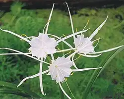 Pancratistatin occurs naturally in Hawaiian spider lily, a flowering plant within the family Amaryllidaceae. Pancratistatin is mostly found in the bulb tissues of spider lilies. It has been shown that the enrichment of atmospheric CO2 can enhance the production of antiviral secondary metabolites, including pancratistatin, in these plants.[3] Pancratistatin can be isolated from the tropical bulbs of Hymenocallis littoralis in the order of 100 to 150 mg/kg when bulbs are obtained from the wild type in Hawaii. However, the compound has to be commercially extracted from field- and greenhouse-grown bulbs or from tissue cultures cultivated, for example, in Arizona, which generate lower levels of pancratistatin (a maximum of 22 mg/kg) even in the peak month of October. After October, when the bulb becomes dormant, levels of pancratistatin drop, down to only 4 mg/kg by May. Field-grown bulbs, which show monthly changes in pancratistatin content, generate somewhat smaller amounts (2–5 mg/kg) compared to those grown in greenhouses cultivated over the same period.[4] There are about 40 different spider lily species worldwide and they are mainly native to the Andes of South America.