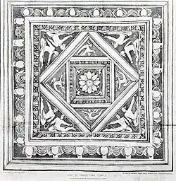 The ceiling of the temple is noted for being the best preserved of ancient Kashmiri Hindu stone temples.[12] It is intricately carved, consisting of three overlapping squares, formed of nine stone slabs.[24] Four triangular slabs each are arranged to form the bottom and middle squares, while the top square consists of a single square slab with a full-blown lotus relief.[25]