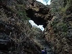 Pandupole is a tourist spot in the Sariska Tiger Reserve (Alwar district, Rajasthan), and it has an ancient mythical connotation attached to it. Pandupole was the ancient site where the strongest among the Pandavas, Bhima, vanquished the giant demon Hidimbb and in return for this victory earned the hand of his sister, Hidimba. It also has a cascading spring emerging from hard and compact rocks. Legend has it that the Pandava brother took refuge here during their exile. The main path takes to Pandupole which is not only a beautiful spot picturesque 35-ft waterfall is another attraction here and next to the fall is a charming little Hanuman temple. This area is abundant in langurs, peafowl, spurfowl, and ubiquitous tree pies. On the way to Pandupole, Karnakabas Lake, Brahmnath, Kalighati Chauki and Bhaironghati are also there. [1]