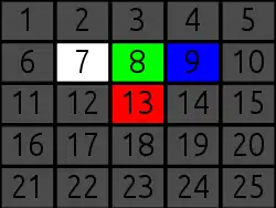 Four contestants, each designated by a different color (red, green, white, and blue), compete. The game is played on a grid of twenty-five numbered boxes in a manner similar to the game Reversi.