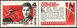 The story of the Twenty-Eight gained wide publicity. In March 1942, Nikolai Tikhonov wrote a poem entitled "A Verse to the Twenty Eight Guardsmen".[14] Other authors followed suit and several literary works dealing with the battle at Dubosekovo were published. Consequently, the Guardsmen became celebrated heroes throughout the Soviet Union.[15][16]
