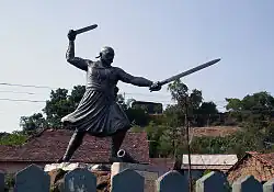 In 1700, Rajaram, died leaving behind a 12-year-old son—Shivaji II—by his wife Tarabai.[13] In 1705, Tarabai asserted her autonomy by founding an independent dynasty in the name of her son Shivaji II and ruling it as regent with Panhala as her headquarters. In Tarabai Ranisaheb's war with Shahuji of Satara in 1708, Shahu took Panhala and Tarabai fled to Malvan in Ratnagiri. Shortly after, in 1709, Tarabai again took Panhala, established a separate state (Kolhapur Rajaram by his second wife Rajasbai Ranisaheb succeeded to the throne. He died without issue in 1760. His widow Jijabai Ranisaheb adopted the son of a Sahaja Bhonsle of Canvas. Thus, Jijabai Ranisaheb became the acting regent during the time that her adopted son was a minor. She came to believe that to prevent the fall of Panhala, the Mahakali shrine at the fort had to be ritually offered human blood for the appeasement of Goddess Kali. She would periodically send out her soldiers at night to scour the neighboring villages for victims.[3] This practice would continue until her death in 1772. One of the towers near were these sacrifices occurred is still called the Kali tower. There were reports of Jijabai Ranisaheb bestowing a plot of land to an oilman or Teli in return for the grant of his daughter-in-law to be buried alive under one of the Panhala towers.[3] A shrine to the Teli's daughter-in-law (Gangubai) was subsequently erected and it is still a pilgrimage site for the people of the Teli community.[14]