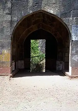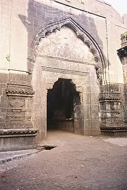 The Teen Darwaza was one of the three double gateways of the fort - the others being the Char Darwaja and Wagh Darwaja.[27] The Char Darwaza was destroyed when during the British siege. The Teen Darwaja gate which is the main entrance to the fort is located north of the Andhar Bavai[19] on the West side of the fort.[21] It is a double gate with a court in between that has arcades. The outer gate has an ornate chamber on top with decorated eaves. The inner gate from the court is highly decorated with the lintel having finely carved motifs,[25] including one of Ganesh. The latter has been placed by the Marathas during their occupation of the fort.[25] There are three Persian inscriptions—one on top and one each on either side. All three declare that the gate "was built in the reign of Ibrahim Adil Shah I by Malik Daud Aki son of Minister Ahmed" in 954 AH (1534 CE).[3][4]