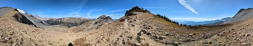 The hike to the gap along the Wonderland Trail, which can be joined 0.1 miles (0.16 km) from Fryingpan Creek Trailhead on Sunrise Road, has been described as "possibly the best day hike" in Mount Rainier National Park; it is 10.6 miles (17.1 km) roundtrip with 3,000 feet (910 m) of elevation gain.[3][4] The hike is one of the most popular in the park, and can be crowded between late July and September,[3][5] and it can be difficult to find parking at the trailhead.[6] It has been rated both easy[3] and strenuous.[4] After Summerland—a campsite on a knob about 4 miles (6.4 km) from the trailhead and 1.3 miles (2.1 km) below Panhandle Gap—the trail can be hard to follow,[3][7] crossing Fryingpan Creek can be hazardous,[2] and in winter and spring there can also be avalanche risk approaching the gap.[6] At around 6,750 feet (2,060 m), the gap is the highest point on the Wonderland Trail encircling the mountain.[4] South of the gap, the Wonderland Trail continues towards Indian Bar[6] and Box Canyon,[8] as the terrain drops off into Ohanapecosh Park, which drains into the Ohanapecosh River.[2][9][4] The most popular climbing routes to Banshee Peak and the Cowlitz Chimneys arrive via Panhandle Gap, and while Banshee is a walk-up, the Middle Cowlitz Chimney can be climbed using a Class 2 scrambling route and the Main Chimney is Class 3.[6] On a clear day, Mount Adams is visible from Panhandle Gap,[5] but Mount Rainier itself is largely blocked by the ridge to the west.[7] Some through-hikers deviate to the Eastside Trail, an alternate route to avoid snow and potentially dangerous conditions around the gap.[7]