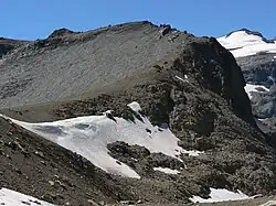 Panhandle Gap is above the tree line and the terrain largely consists of rock and ice past Summerland.[9][4] The rock around the gap—partly consisting of hypersthene hornblende dacite that may have formed by Tatoosh intrusion[10] as well as andesite[11]—is more red than that found a short distance to the north, closer to Summerland.[3] Snow often covers the trail around the gap into late summer.[12][2][6] Species found at the gap include horned lark, ptarmigan, mountain goats, Smelowskia, and Tolmie's saxifrage.[9][2]