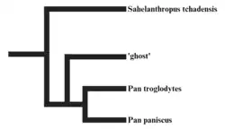 Panina is one of two subtribes of tribe Hominini; the other is Australopithecina (or Hominina). The genus Sahelanthropus lived around the time of the divergence, and may have then been found among one of these groups: a member of either branch of lineage; a precursor to both lineages; or possibly an early member of tribe Gorillini, which previously had split from the human-chimpanzee lineage. Regardless, the morphology of S. tchadensis supports the theory that, at and after the divergence, hominins then are unlikely to resemble in appearance(s) with any number of derived characters of their descendants.[8][9] A genetic study conducted in 2010 surveyed chimpanzee mitochondrial genomes and discovered the presence of an extinct ghost lineage, (i.e., fossil evidence doesn't exist yet) of Panina that diverged around 3.3 mya and began interbreeding with bonobos (Pan paniscus), who then interbred with chimpanzees (Pan troglodytes). This signature is carried more heavily in P. troglodytes despite having interbred with bonobos first, seeing as how they occupy a greater range.[10]