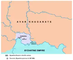 ![]() The Byzantine northern Balkans in the 6th century. The province of Pannonia is located in the northwestern corner of imperial territory. | |||||||