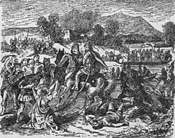 Each year, the Huns [Avars] came to the Slavs, to spend the winter with them; then they took the wives and daughters of the Slavs and slept with them, and among the other mistreatments [already mentioned] the Slavs were also forced to pay levies to the Huns. But the sons of the Huns, who were [then] raised with the wives and daughters of these Wends could not finally endure this oppression anymore and refused obedience to the Huns and began, as already mentioned, a rebellion. When now the Wendish army went against the Huns, the [aforementioned] merchant Samo accompanied the same. And so Samo's bravery proved itself in wonderful ways and a huge mass of Huns fell to the sword of the Wends.