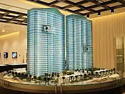 Panorama Towers was announced on September 7, 2003, as a business venture between partners Andrew Sasson and Laurence Hallier, who owned Sasson/Hallier Development LLC. The project was announced as a 250-unit condominium complex that would stand 30 stories high and would be built on 10.5 acres (4.2 ha) of land.[6] Las Vegas-based architecture firm Klai Juba was hired to design the project.[7] Klai Juba's iconic aqua-blue glass towers have been nominated and won numerous awards from the design, construction and excellence service of the complex. Among the many honours, was The Best of Las Vegas' architecture award by the editors of the Las Vegas Review-Journal, and "High-Rise of the Year" by the Community Associations Institute.[8] Sasson described the target clientele as local residents who enjoy high-end design, and the ideal central location of being only a block from the heart of the Las Vegas Strip, which he labeled as Las Vegas' beachfront.[9][10] The project was named for its panoramic views of the Las Vegas Strip and of Red Rock Canyon.[11]