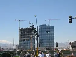 Sales for a second tower had begun by July 2004.[12] By September 2004, construction was underway on one of the towers. That month, a 35-story third tower, standing 500 feet (150 m) tall, was approved by Clark County. The third tower would be slightly smaller than the other two towers, with only 250 units compared to 350 for the others. The second tower was scheduled to begin construction in January 2005, with construction on the third tower scheduled to begin six months later.[13] During construction, actors Leonardo DiCaprio and Tobey Maguire purchased units at Panorama Towers.[14][15][16] DiCaprio also attended the groundbreaking ceremony, held in October 2004.[14][11]