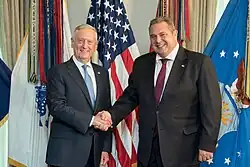 In 2017, Panos Kammenos made a trip to London where he admitted staying in an expensive hotel and using the Greek Embassy's luxury car to go shopping for a Barbie doll for his daughter. Opposition said that the amount of money he declared in his bank account “no way justifies the expenses that he appears to be constantly making,” but there haven't been any investigations of his behavior or spending.[33] Later, he also admitted that he visited and played at the hotel's casino. The New Democracy's vice president Adonis Georgiadis commented that according to the code of conduct of the Ministers the presence of the Minister of Defence at a casino is a criminal offence.[34] President of To Potami, Stavros Theodorakis, wondered how Panos Kammenos could afford to go on vacations to the Alps and play at the casino while he officially claims that his bank deposits worth only 8,500 euros.[35] The same year his name was also involved in an arm deal scandal. The deal was to sell 66 million euros in missiles and bombs to Saudi Arabia. Opposition accused him that the attempted deal was being done through a shadowy middleman, a broker that was in violation of laws requiring defense contracts to be at the government-to-government level after former defense ministers were caught up in scandals and stealing scores of millions of euros. The Greek Consul in Saudi Arabia said that Saudi authorities were unaware of who the middleman was, and asked for the agreement to become government to government.[36][37] In addition the middleman was a convicted arms smuggler.[38] Also, human rights groups, like Amnesty International, called on Greece to immediately stop the sale and transfer of military equipment to Saudi Arabia as the munitions could end up being used by the Gulf state in its war against neighbouring Yemen, where civilians were also targeted.[38] Same year, after a Eurogroup meeting and a deal between Greece and EU, the Twitter account of Panos Kammenos tweeted a photo of a tie with Phallus. After six minutes the tweet deleted and the minister claimed it was “the kid” who did it. He did not clarify whether it was his son or some hacker. His explanation was not accepted and the opposition, twitter users and media condemned the tweet. People wondered if Kammenos had intentionally uploaded the controversial tie photo in a clumsy but clear attempt to link the agreement with the promise of prime minister Alexis Tsipras to wear a tie when the country returns to growth.[39][40]