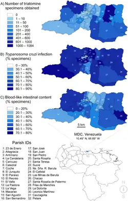 A 2005 study conducted by the Universidad Central de Venezuela, used Panstrongylus specimens collected from Caracas City and the neighboring areas of Miranda and Vargas States. Through the use of a dot-ELISA test and other techniques to determine the presence of Trypanosoma cruzi, it was found through the examination of feces that 67 of the 88 (76.1%) specimens collected were carrying the parasite and that 53 (60.2%) of those reacted positively to human antiserum.[6] A 2014 publication of citizen science–based domiciliary triatomine collection carried out between 2007 and 2013 in the MDC has advanced understanding of urban T. cruzi prevalence, this publication shows the geographical distribution of triatomine bugs in Caracas, natural infection of triatomine bugs with T. cruzi, the presence of blood in the stomachs of the triatomine bugs and a study of the nymphal stages of P. geniculatus in Caracas. A total of 3551 triatomines were captured from 31 of the 32 parishes surveyed. The vast majority of these were identified as P. geniculatus (98.96%), followed by Triatoma nigromaculata (0.59%), Triatoma maculata (0.39%) and Rhodnius prolixus (0.06%).[7] For 2023 a recent publication demonstrates risk of urban Chagas disease transmission in Caracas, Venezuela by vector mapping and bloodmeal metabarcoding.[8]