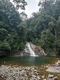 The Pantai Timur are a subrange of the wider Tenasserim Hills system, that defines the backbone of the Malay Peninsula. It covers Machang, Gua Musang and Kuala Krai Districts in southeastern Kelantan, the western frontier of Terengganu comprising the districts of Besut, Setiu, Hulu Terengganu, Marang, Dungun and Kemaman; and Jerantut and Kuantan Districts in northeastern Pahang. It has an average height of 1,300 metres (4,300 ft) above sea level. The highest elevation is recorded as 1,571 metres (5,154 ft) at an unnamed peak located on the Hulu Terengganu-Dungun district line, which is unofficially known as Terengganu Indah Abadi Peak.[2] The highest officially named mountain is Mount Lawit in Besut at 1,519 metres (4,984 ft) above sea level, of which it remains the de facto highest peak of the entire mountain range.