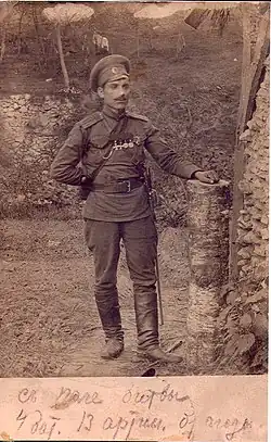 Panteleimon Belochub fought with distinction in WWI. For valor under enemy fire, he was decorated with the Cross of St. George, 4th and 3rd class, and two medals of St. George. During this period, he gained experience in field and horse artillery, which became important in his later military career. For instance, in January 1915, Belochub earned an award by successfully aiming artillery fire at the advancing Austrian infantry and allowing the Russians to regroup while avoiding losses.[3]