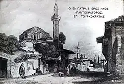 During the Venetian rule of Patras in the fifteen century it was converted into a Catholic church and re-dedicated to Saint Mark.[1] Much later, after Patras fell to the Ottoman Turks, it was converted into a mosque and called Kursum Mosque, meaning 'the lead-roofed mosque', due to the church's dome that was covered with lead.[1][2] According to other sources, it was called the Fethiye Mosque, meaning "mosque of the conquest."[3]