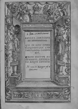 In 1504, Cortesi published at Rome In quatuor libros Sententiarum ... disputationes, "an attempt to elimintate the dissidence between theological wisdom and profane eloquence". The apotheosis of the Ciceronianism expressed in the letter to Poliziano, it was dedicated to Pope Julius II. It was reprinted in 1513 by Jodocus Badius at Paris and by Johann Froben at Basel, and again at Basel in 1540 by Henricus Petrus.[2]