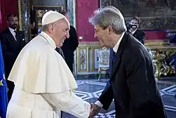 Despite being considered a caretaker Prime Minister upon his appointment, during his time in office Gentiloni successfully delivered major reforms that had been delayed for many years, including the implementation of the advance healthcare directive and the passage of a new electoral law.[8][9] He also introduced stricter rules on immigration and social security, in an attempt to counteract the European migration crisis.[10] In foreign policy, Gentiloni built on his time as Foreign Minister by projecting a strong Europeanist stance, whilst at the same time building close relations with the Arab countries of the Persian Gulf, and notably overseeing a normalisation of Italian relations with India after years of tensions.[11][12] Gentiloni resigned as Prime Minister following the 2018 election. In September 2019, he was nominated by the Conte Government to become Italy's new European Commissioner, and was given the key portfolio of overseeing the European Union Economy.