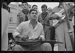 By 1941, Lamperez learned to play a Hawaiian-style lap steel guitar[8] and traveled with Happy Fats to Dallas to record for Bluebird Records.[9] During the session, he wrote the song "In The House at the End of the Road". However, soon after, he was drafted into the US Army, became a Sergeant, and fought in Europe during World War II. He was captured by the Germans and held prisoner of war in a stalag. He escaped four times but never got very far, however, he made a fiddle while captured and the guards enjoyed his music.[10]