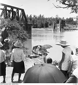 During the World War II, the railway bridge was however destroyed by Allied bombings to prevent it being used by the Japanese with the site also becoming one of the area where the Imperial Japanese Army surrendering to the Australian Imperial Force.[12][13] After the end of the war, the locals need to use small boats to transport people and goods on the other side of the river without the bridge.[6] A new bridge was later constructed although many rumours began to spread around at the time before the bridge construction that to ensure a successful construction of its structure, human heads must be buried at the foundation of the bridge with many locals believed that head hunters would be sent out to look for victims at night that causing everyone to be vigilant.[6]