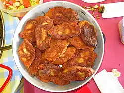 Paparajotes are a typical dessert of Murcia, Spain[1] made with lemon leaves coated with a dough made with flour and egg that are fried and sprinkled with powdered sugar and cinnamon.