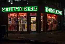 Papaya King opened a restaurant at 1645 Wilcox Ave. in Hollywood (Los Angeles) California in 2011, but it had closed by the beginning of 2013. In May 2013, Papaya King opened a concept store on St. Marks Place, a historical and cultural crossroads in New York City’s East Village neighborhood. The store featured a recessed patio area in front, widely referred to as “the stoop,”[4] where customers and locals gathered. The store featured many of the classic elements that characterize the 86th Street location, with additional experiences such as vintage arcade games, a projector screen, a sound system, and branded merchandise. This location closed in November 2017 when the building was sold to a real estate developer.[5] During the summer of 2014, Papaya King opened its first food truck that is parked throughout Manhattan and Brooklyn.[6]