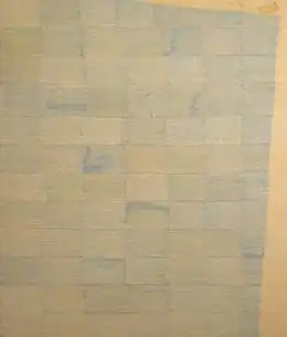 This painting represents one of the many works in Gallagher's first major body of work she created in the 1990s. A large scale painting, this work comprises 12 rows of penmanship paper, totaling 84 pieces of paper, glued to the canvas, while the canvas was wet, creating a bubbled, wrinkled appearance. On the paper, Gallagher used blue ink to create small lips, which represent stereotypes of African-Americans.[1]