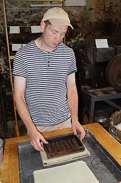 In the outbuilding of the museum he runs a modern papermaking workshop. There, the classical papermaking industry is experiencing a renaissance: Each sheet of handmade paper is drawn by hand and dried in air as it was then. The paper differs from the machine-made papers in its finely grained surface and four-sided deckle edge. The basis for paper production in his workshop are historical and modern scoops, various presses and a paper Dutchman for processing the fibers. Depending on the desired paper quality, today high quality raw materials are used. In addition to fabric scraps, various fibers are used: cotton, flax, hemp or abaca. Pigments, mottling and inclusions in handmade paper complete the range of different paper types. In addition, papers are produced for high-quality printmaking. In collaboration with various artists, large bows with elaborate watermarks are created by hand.