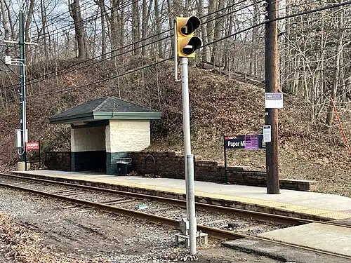 Trolleys arriving at this station travel between 69th Street Transit Center in Upper Darby Township, Pennsylvania and Orange Street in Media, Pennsylvania. As part of a major line renovation project in 2010 the shelter at the stop was re-roofed and painted, and a metal bench and platform plantings were added, providing passengers a pleasant waiting area and shelter from the elements. It also has free parking. However these are facilities of Smedley Park, rather than of SEPTA. No elevated platforms exist at this station. Unlike most stops along the D1 in Springfield, the Paper Mill Road stop is located along a section of single track that takes the line through wooded parkland west from Woodland Avenue to the western limit of the township (the Crum Creek Bridge) and a few hundred yards further into Nether Providence Township. Like station stops at Woodland Avenue, Thomson Road, Springfield Mall, and Bowling Green, passengers enter and leave the trolleys from the side of the single-track line where the shelter stands. At an isolated turnout in wooded Smedley Park in Nether Providence Township west of Paper Mill Road Station and east of Pine Ridge station, the line again becomes double-tracked for the stretch to the Media town border at Bowling Green station.