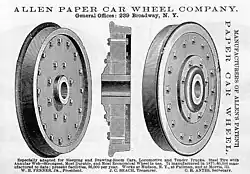 Paper car wheels were composite wheels of railway carriages, made from a wrought iron or steel rim bolted to an iron hub with an interlayer of laminated paper.[1] The center was made of compressed paper held between two plate-iron disks.[2] Their ability to dampen rail/wheel noise resulted in a quiet and smooth ride for the passengers of North American Pullman dining and sleeping cars.[3]