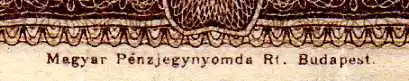 Magyar Pénzjegynyomda Rt. Budapest. printer mark on a 100 korona (1923) state note |