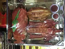 Papier-mâché shops in Hong Kong are usually designed in traditional Chinese style without fancy decoration. The layout seems to be disorganised but the goods are arranged in an orderly fashion. A large tablet is placed on top of the door with the name of the shop written in gold, yellow or red, around which there are some Chinese lanterns for decoration. Some shelves are put outside the shops for displaying products. For the setting, some simple closets are placed all around the shop with a variety of products on them. A glass case table forms a corner for the shop owner. Generally, there are tables placed in the middle of the shop, with a lot of packages of foss paper and papier-mâché placed on them for ancestral worship, which are sorted by plastic baskets or cartons. The 3D papier-mâché items are wrapped in plastic bags and hung inside the shop.[18] During some traditional Chinese festivals, such as the mid-autumn festival, the festive products will also be wrapped in plastic bags and hung outside the shop to attract customers.
